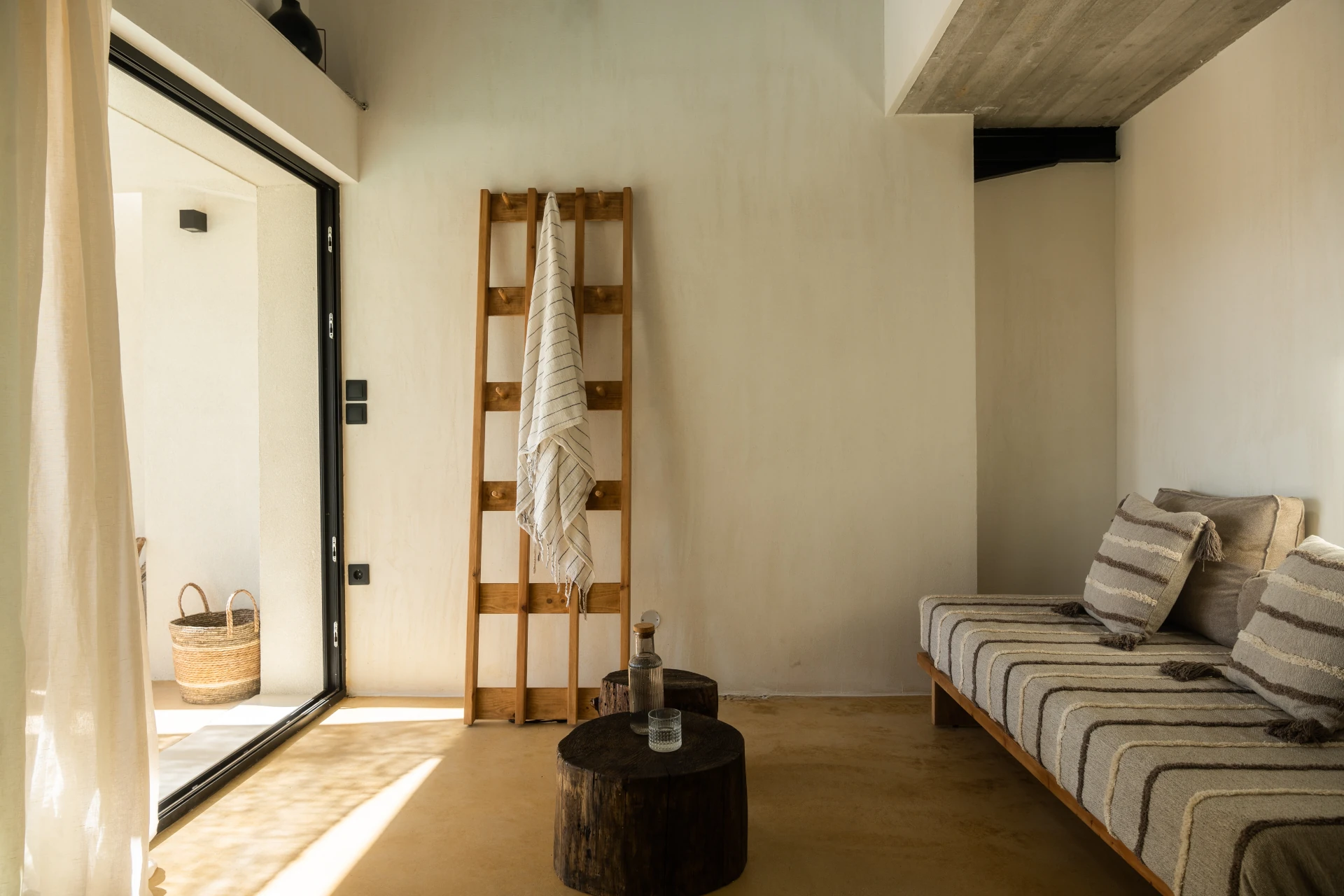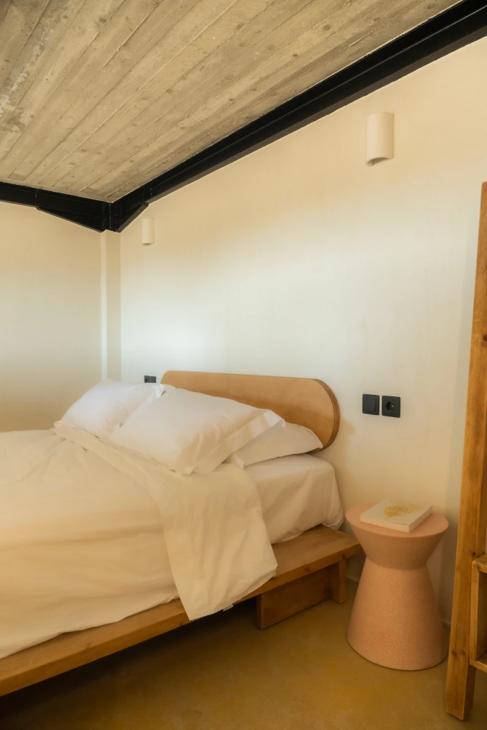 A Skyrian 'sfa' with a modern twist, comfortable, featuring a double bed and luxurious Cocomat mattresses, offering a restful and rejuvenating sleep experience.