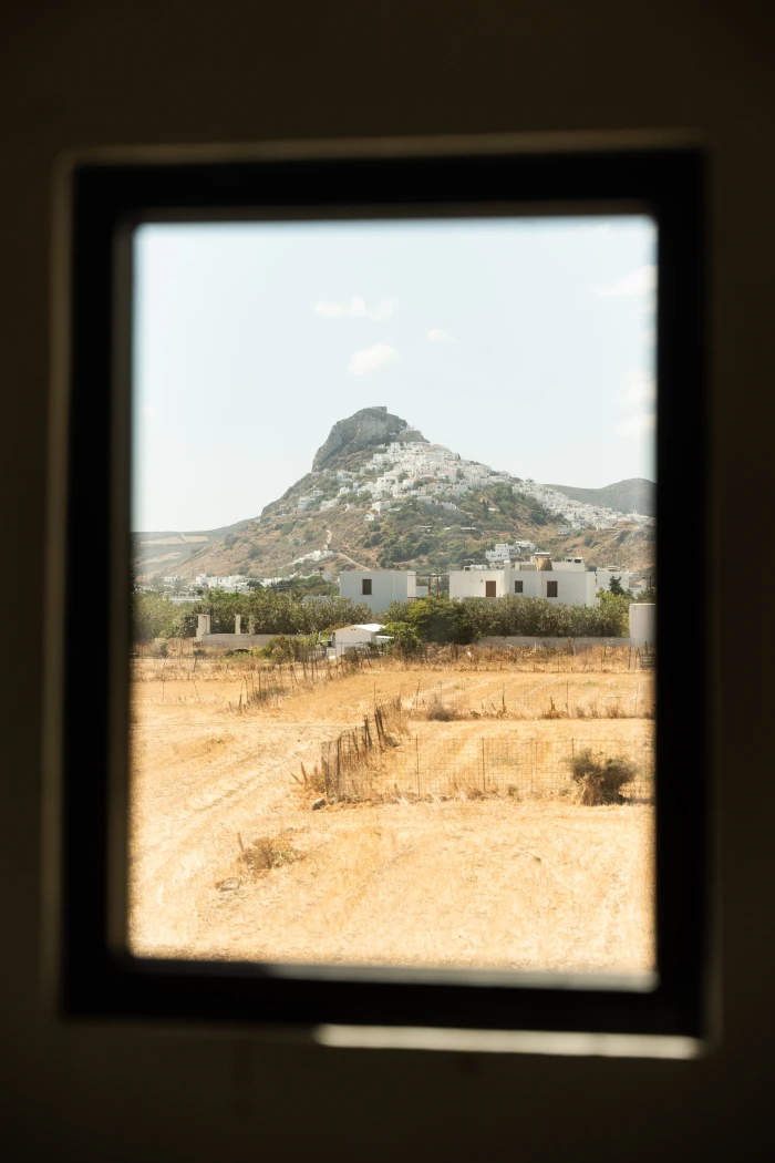 From the suite, the view of Chora unfolds like a timeless painting. Perched atop Skyros’ rolling hills, the island’s main village cascades down in a charming tumble of whitewashed cubic houses, their flat roofs kissed by the sun.