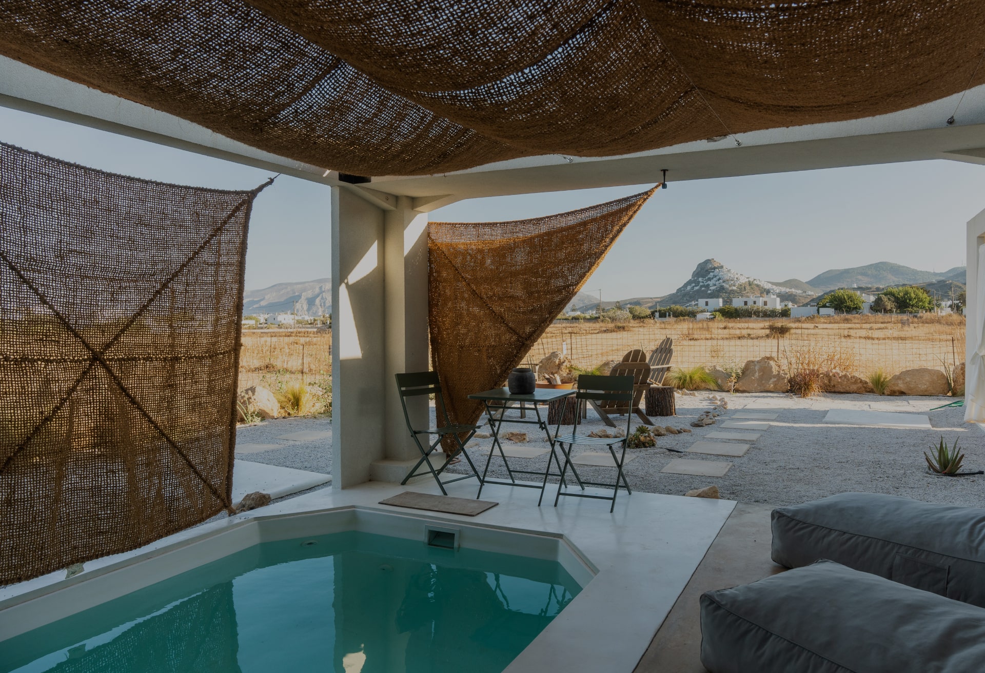 With every dip, you’re treated to sweeping views of Chora’s cascading cubic homes and the distant sparkle of the Aegean Sea, blending luxury with the raw beauty of Skyros. This secluded retreat invites you to unwind in style, soaking in both the cool waters and the captivating panorama of island life unfolding below..
